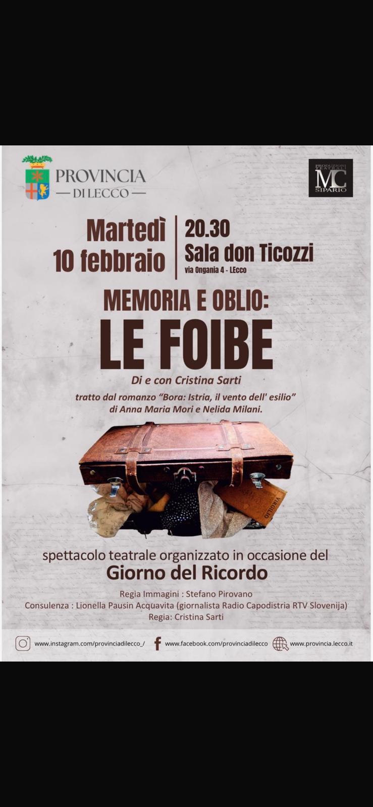 Martedì 10 febbraio alle ore 20.30 presso la Sala don Ticozzi di via Ongania 4 a Lecco si terrà un'opera teatrale dal titolo "Memoria e oblio: le foibe" tratto dal romanzo "Bora: Istria, il vento dell'esilio" di Anna Maria Mori e Nelida Milani.
